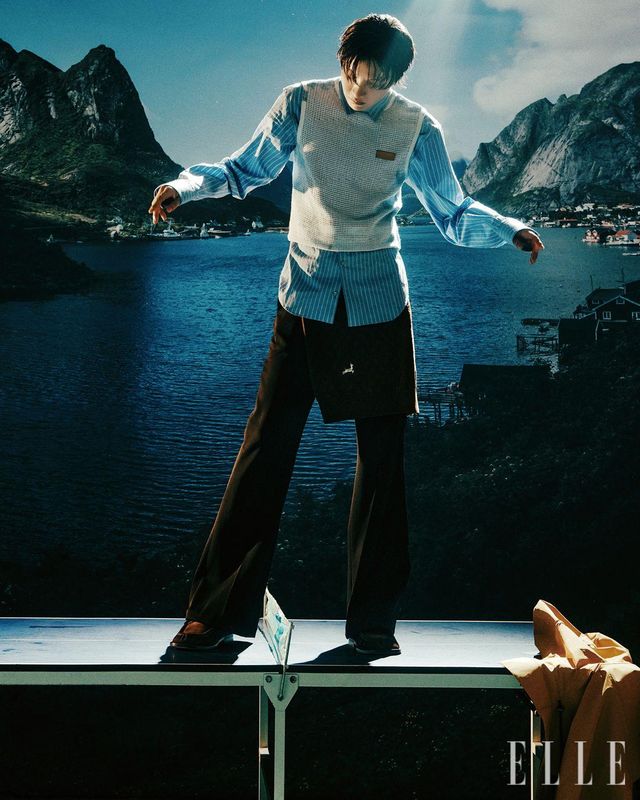 제이홉이 입은 핀스트라이프 셔츠와 베스트, 플래어 팬츠와 엠브로이드 니트 톱, 로퍼, 옐로 컬러 아우터는 모두 Louis Vuitton.