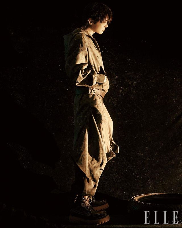 제이홉이 입은 옐로 아우터웨어는 Louis Vuitton.