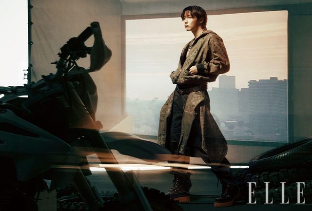 제이홉이 입은 모노그램 엠벨리시드 후디드 블루종과 왁스드 데님 팬츠, 허리에 두른 워크웨어 오버 셔츠와 벨트, 앵클부츠, 목걸이로 연출한 체인 벨트는 모두 Louis Vuitton.