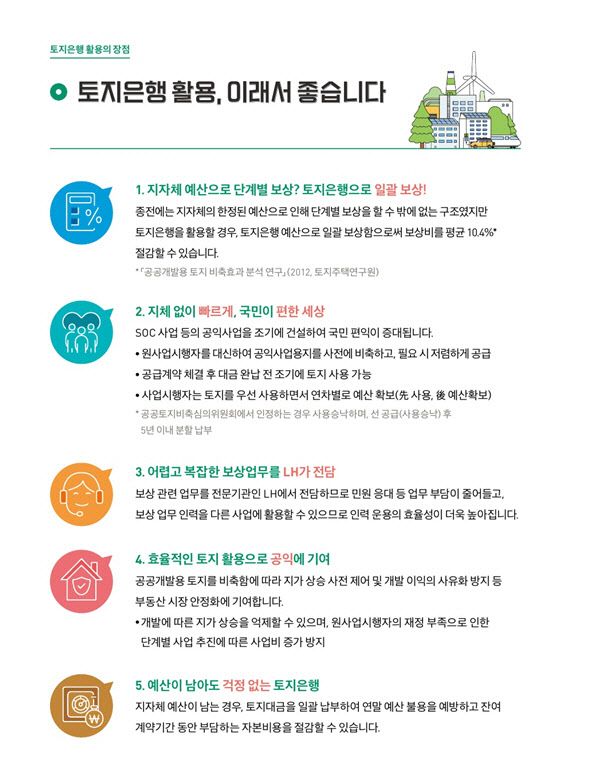 이에 지자체는 보상 관련 수행 조직과 인력을 별도로 편성할 필요 없이 토지 확보가 가능하다. 사업 기간을 대폭 단축할 수 있을 뿐 아니라 사업 장기화 및 토지 비용 상승에 따른 사업비 증가 우려도 해소할 수 있다.