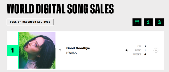 지난주 43위로 첫 진입한 ‘빌보드 글로벌 200’에서도 32위에 올라 뜨거운 인기몰이를 이어갔다. 화사의 ‘굿 굿바이’는 ‘제46회 청룡영화상’에서 박정민과의 축하무대 후 그야말로 ‘신드롬급 인기’를 증명하고 있다.