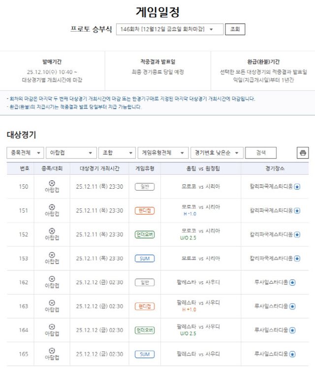 이번 프로토 승부식 146회차에서 아랍컵을 대상으로 하는 게임은 12월 11일 오후 11시30분에 칼리파 국제스타디움에서 열리는 모로코-시리아(150~153번)전과 12일 오전 2시 30분에 루사일 스타디움에서 개최되는 팔레스타인-사우디(162~165번)전 등 총 2경기다.