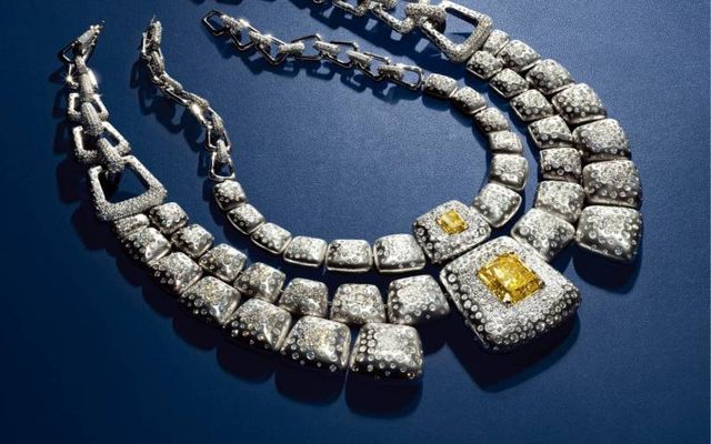 나뭇잎 모양의 화이트골드 테두리로 총 1.21캐럿 라운드 브릴리언트 컷 다이아몬드를 세팅한 오픈워크 화이트골드 펜던트 이어링은 가격 미정, Buccellati. 시그너처인 불규칙 파베 세팅 기법으로 장식한 사비아 하이 주얼리 네크리스는 가격 미정, Pomellato.