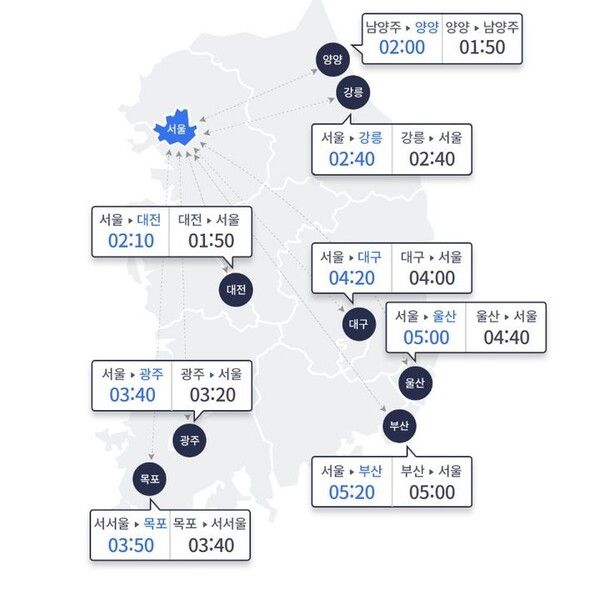 상행선은 ▲부산~서울 5시간 ▲대구~서울 4시간 ▲광주~서울 3시간20분 ▲대전~서울 1시간50분 ▲강릉~서울 2시간40분 ▲울산~서울 4시간40분 ▲목포~서서울 3시간40분이다.