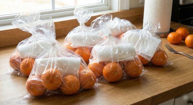 선별이 끝나면 적당한 크기의 봉지에 귤을 나눠 담고, 수분 제거를 위해 키친타월 한 장을 함께 넣는다. 귤은 호흡하는 과일이므로 봉지에 구멍을 몇 개 뚫어준다. 구멍이 너무 많으면 건조해지고, 전혀 없으면 곰팡이가 생길 수 있어 적당한 개수만 내면 된다.