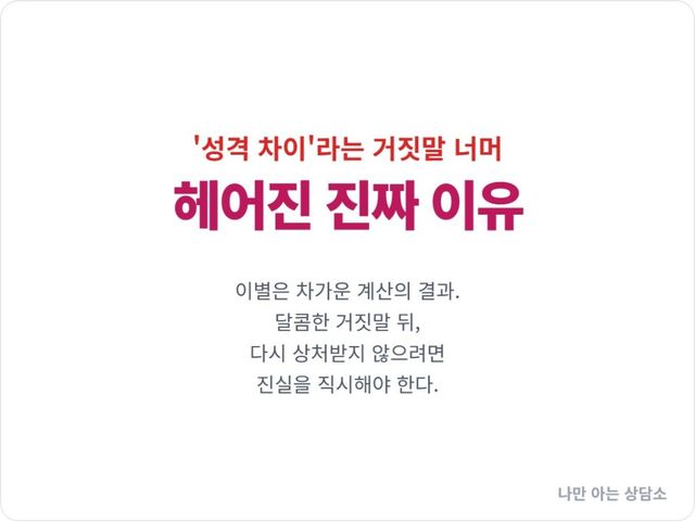 이별의 순간, 우리는 대부분 배우가 된다. 삼류 드라마에서 수백 번은 들어봤을 대사들을 읊조린다. “너는 나에게 과분한 사람이야,” “사랑해서 보내주는 거야,” 혹은 그 지긋지긋한 “성격 차이.” 이 말들은 사실이 아니다.