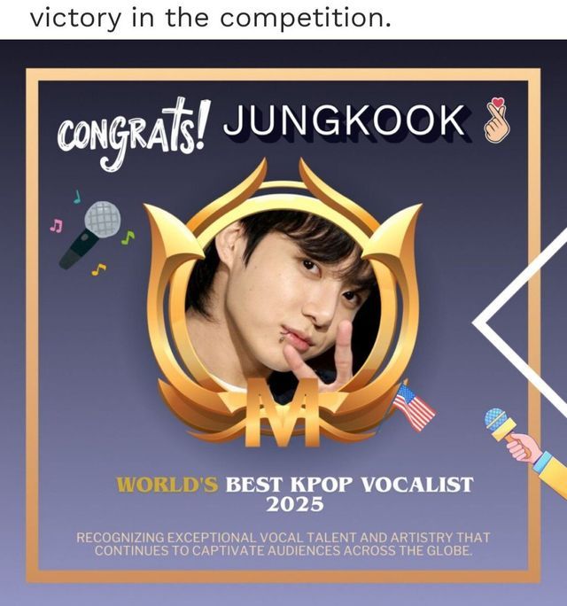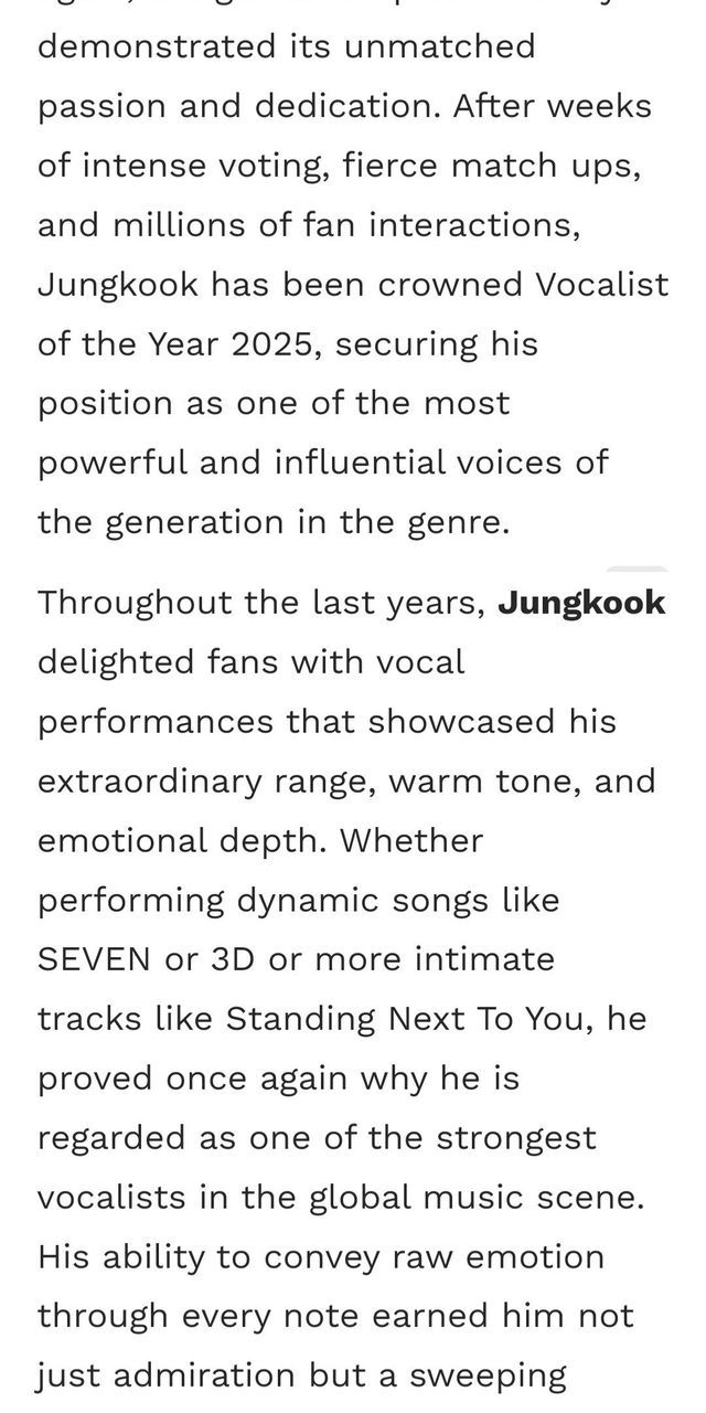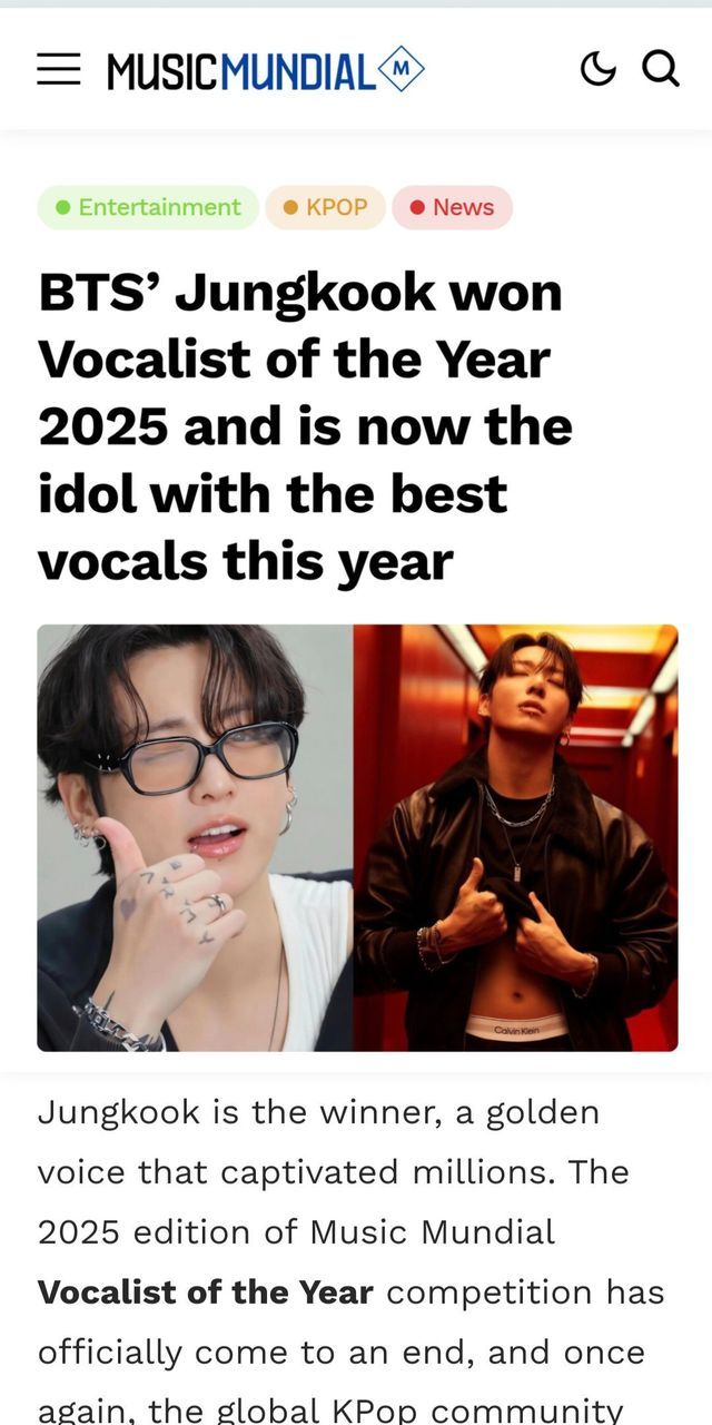 해외 음악 매체 ‘뮤직 문디알’은 공식 홈페이지를 통해 ‘2025년 최고의 K-팝 보컬리스트’ 투표 결과를 공개했고, 정국이 최종 1위를 차지했다. 해당 매체는 정국에 대해 “동세대에서 가장 강력하고 영향력 있는 보컬 가운데 한 명이라는 입지를 굳혔다”고 평가했다.