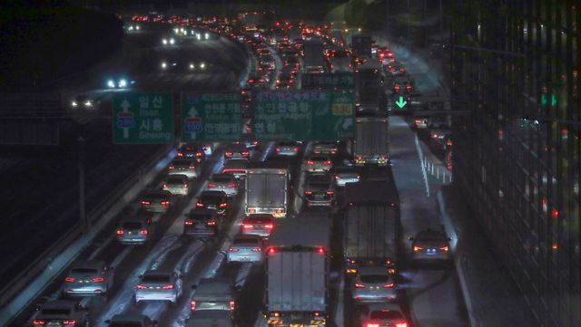 경기 시흥시 수도권 제1순환고속도로에 눈이 쌓여 퇴근길 차량들이 거북이 주행을 하고 있다. 기사의 이해를 돕기 위한 사진 / 뉴스1
