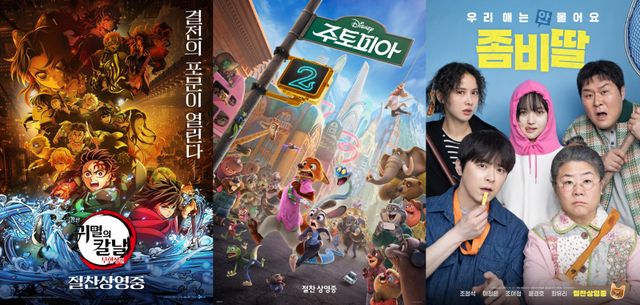 15일 기준 2025년 흥행작 1위 ‘극장판 귀멸의 칼날: 무한성편’(왼쪽부터), 2위 ‘주토피아2’, 3위 ‘좀비딸’ 포스터 / 사진=애니맥스브로드캐스팅코리아·디즈니플러스코리아·NEW 제공