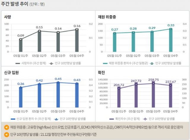 재원 위중증 환자는 166명으로 전날(169명)보다 3명 감소했다. 최근 일주일 동안 추이는 180명→ 176명→ 183명→ 170명→ 176명→ 169명→ 166명 등이다. 주간 일평균 174명이다.