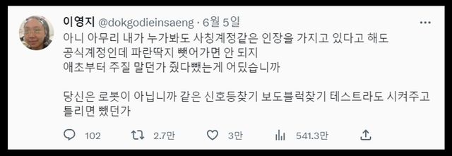 6일 이영지는 자신의 소셜네트워크서비스에 “내가 사칭 계정처럼 보여도 공식 계정인데 파란 딱지 뺏어가면 안 되지. 애초부터 주질 말던가 줬다 뺐는 게 어딨냐”, “‘당신은 로봇이 아닙니까’ 같은 신호등 찾기, 보도블록 찾기 테스트라도 시켜주고 틀리면 뺐던 가”라며 의문을 제기했다.