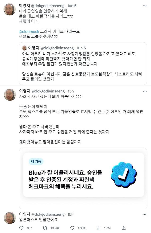하지만 그는 돈을 내면서까지 얻은 '파란 딱지'의 혜택이 텍스트 굵기 또는 기울이기 설정 정도밖에 없다는 사실에 다시 한 번 분노하며 "사래서 사긴 샀는데 왜케 짜증나지? 냅다 돈 주고 사버렸는데 사자마자 바로 안 주고 승인을 거친 뒤에 준다는 것까지"라며 어이없어했고, 결국 '파란 딱지'를 유료화한 일론 머스크를 팔로우 취소했다는 사실을 전했다.