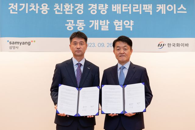 삼양그룹의 화학·식품 계열사 삼양사와 복합소재 전문기업 한국화이바는 26일 서울 종로구 삼양사 본사에서 '전기차용 친환경 경량 배터리팩 케이스 공동 개발 협약(MOU)'을 체결했다고 밝혔다.