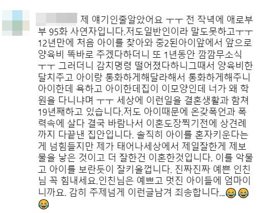 그는 "이런 일을 결혼 생활과 합쳐 19년째 하고 있다. 저도 아이 때문에 이혼 도장 찍기 전에 상견례까지 다 끝낸 집안이다. 솔직히 아이를 혼자 키운다는 게 힘들지만 제가 태어나서 세상에서 제일 잘한 게 제 보물을 낳은 것이고 더 잘한 건 이혼한 것이다. 이를 악물고 아이를 보란 듯이 잘 키울 거다. 힘내시라. 감히 주제넘게 이런 글 남겨 죄송하다"고 덧붙였습니다.