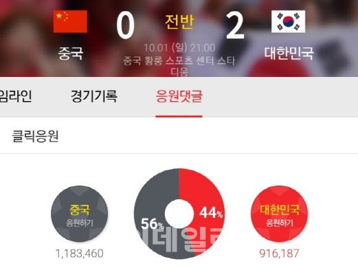 전 전 의원이 올린 캡처에는 전날 밤 9시 기준 포털사이트 다음의 클릭 응원 수가 한국은 91만6187명으로 44%를 차지한 반면, 중국은 118만3460명으로 56%에 달했다.