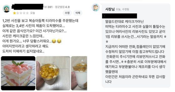 이에 사장은 "말씀드린 대로 케이크가 아닌 떠먹는 티라미수고 사진과 실물이 다를 수는 있으나 여러 개의 리뷰 사진도 있었고 굳이 1점 리뷰 쓰시는 건. 사기라는 말씀까지"라며 불편함을 드러냈다.