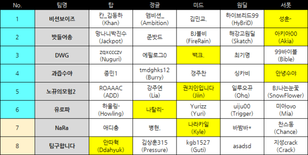 이름부터 심상치 않은 DWG팀은 너구리 바이블을 필두로 챌린저 1천점대 정글로 에필로그0, 유튜브 스타 벡크, DRX 연습생 출신 최기명 등이 한팀을 이룬다.