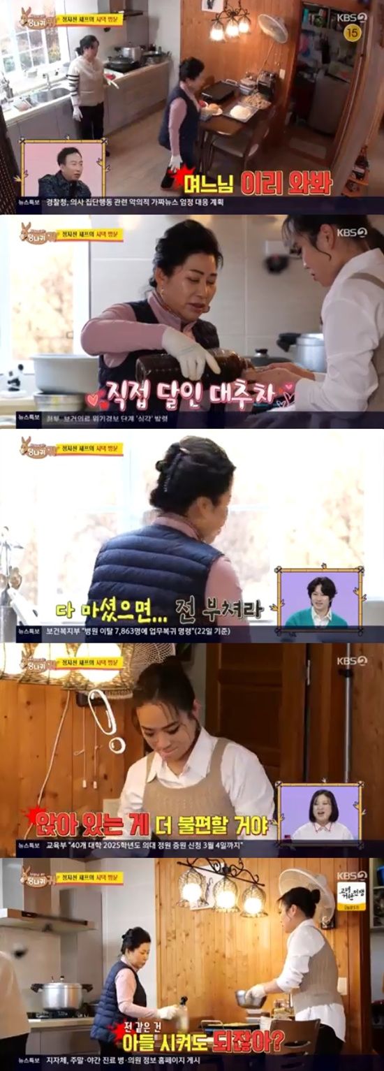 정지선이 전을 부치고 시어머니가 등갈비찜, 육회 등을 만드는 사이 남자들은 소파에 앉아 있었다. 김숙은 "남편들 너무 하다"고 말했다. 그 와중에 정지선 남편은 정지선에게 배가 고프다고 말하며 주방으로 왔다.