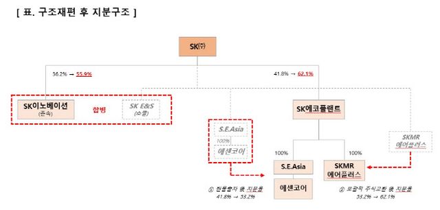 이번 재편이 끝나면 SK㈜의 SK이노베이션 지분율은 종전 36.2%에서 55.9%로, SK에코플랜트 지분율은 41.8%에서 62.1%로 각각 늘어나게 된다.
