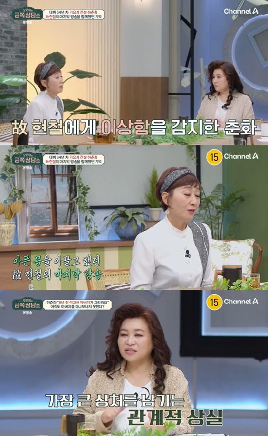 이날 떠나보낸 아버지에 대해 얘기하던 하춘화는 "지금 우리 나이가 가까운 분들을 떠나보내는 일을 많이 겪는다"며 고 현철을 언급했다.