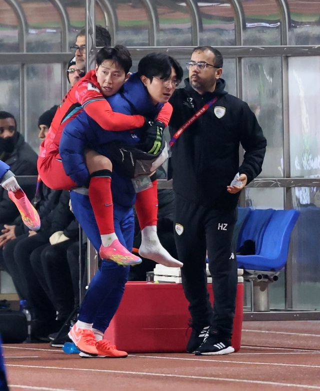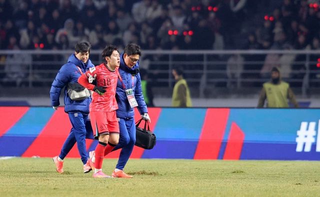 홍명보호의 핵심 자원인 이강인이 오만전 경기 종료 후 부상으로 부축받는 모습이 포착돼 우려가 제기되고 있다.