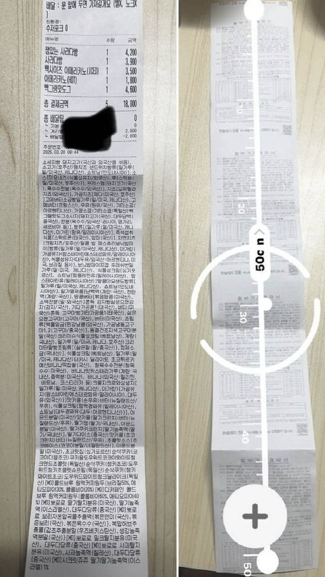 한 네티즌은 영수증 길이를 측정해 보기도 했다. 이를 보면 메뉴를 5개밖에 시키지 않았으나 영수증 길이는 50㎝에 달했다. 네티즌들은 “영수증이 두루마리 휴지처럼 길다” “영수증이 너무 길어서 뭔가 했더니 다 원산지 표기더라” 등의 반응을 보였다. 빽다방에서 근무 중이라는 네티즌은 “영수증 종이(감열지) 자주 주문하게 생겼다”라는 글을 적었다.