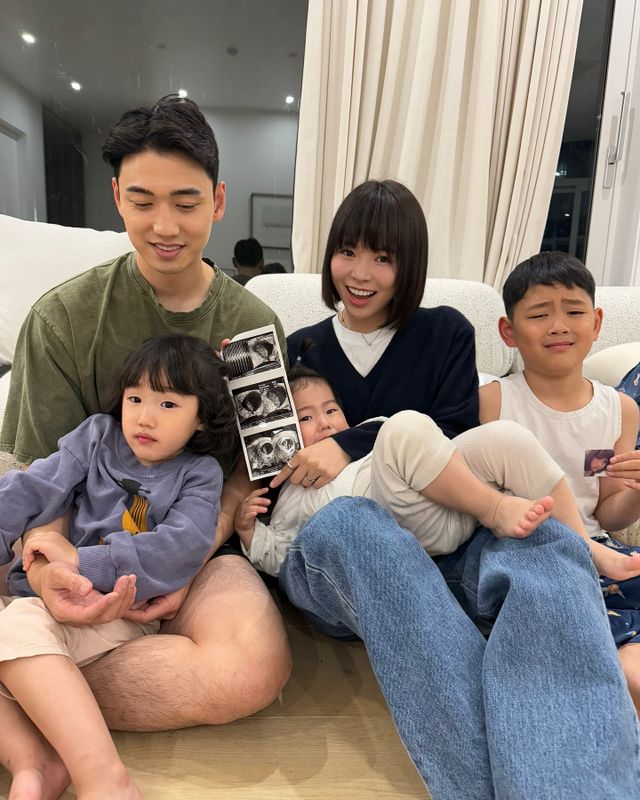 공개한 사진에는 세 아이들을 안은 채 환한 미소로 초음파 사진을 든 하준맘의 모습이 담겨 있다. 특히 얼떨떨한 남편과 첫째 하준 군의 표정이 눈에 띈다.
