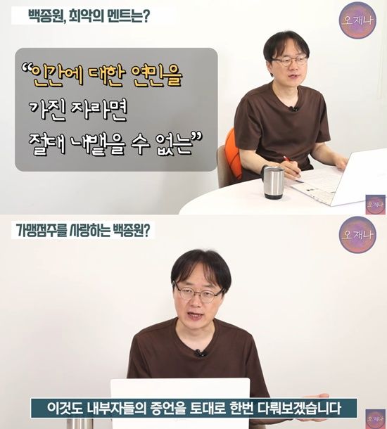 또한 그는 백종원이 MBC 교양프로그램 '질문들'에 출연했던 것도 언급, "자기 회사 가맹점주들을 심하게 모욕하는 원맨쇼를 하더라"고 비판했다.
