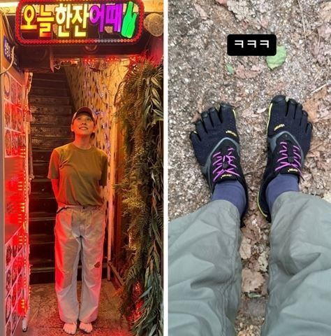 스포티하면서도 이색적인 포인트가 되는 이 신발은 기능성 아웃도어 브랜드로 알려진 제품으로, 발가락이 각각 분리된 형태가 특징이다. 단순히 운동용을 넘어, 일상 룩에도 무심하게 녹여내는 이효리만의 감각이 돋보였다.