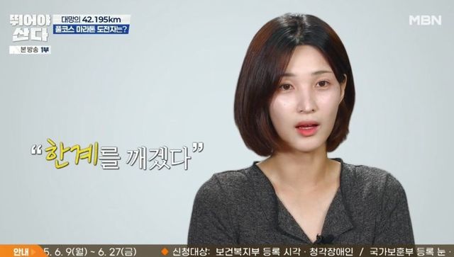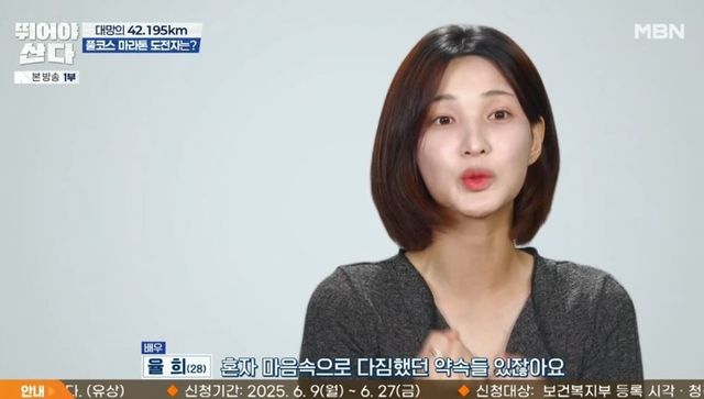 이어 율희, 손정은, 양소영도 등장했다. 양소영은 “벽을 넘어볼 수 있는 경험이 쉽지 않은데, 같이하면 할 수 있을 것 같다”라고 했고, 손정은은 “풀코스 완주가 목표였다. 인생 버킷리스트 같은 거였다”라고 기대했다. 율희는 “혼자 마음속으로 다짐했던 약속들 있지 않냐. ‘한계를 깨겠다’ 같은”이라며 “풀코스 마라톤을 나가지 않으면 완성되지 않는 저와의 약속들이라 도전하게 됐다”라고 포부를 밝혔다.