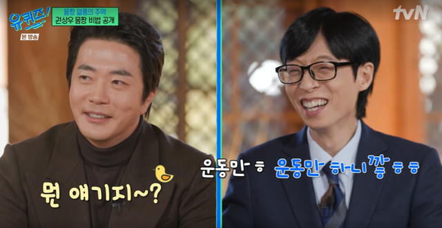 이에 유재석은 “두 분이 만나면 운동도 같이 하지만 ‘둘 다 운동만 하니까 1등 신랑감이다’라는 얘길 한다더라”고 물었고, 이에 권상우는 모르는 척하며 “누가 그런 말을 했냐”고 하더니 “그런 말을 한 적이 있긴 하다”고 시인해 웃음을 자아냈다.