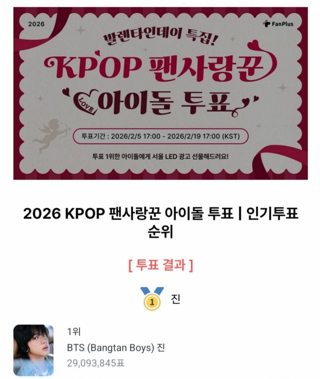 2월 5일부터 19일까지 진행된 이번 투표에서 진은 단 하루도 1위 자리를 내주지 않았고, 최종 2909만3845표를 기록하며 경쟁을 마무리했다. 팬들의 참여가 집중된 결과다.