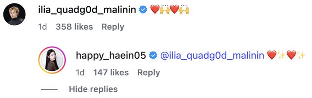 미국 시사주간지 '뉴스위크'는 지난 24일(한국시간) "현재 사회관계망서비스(SNS) 등지에서 월드 챔피언 일리아 말리닌이 동료 올림픽 피겨 스케이터와의 데이트를 가졌다는 논쟁이 벌어지고 있다”고 보도했다. 매체는 "말리닌과 한국 여자 피겨 선수 이해인이 이탈리아 밀라노 현지의 한 카페에서 함께 시간을 보내는 모습이 온라인에 공유되면서 팬들의 관심이 집중됐다"고 설명했다.