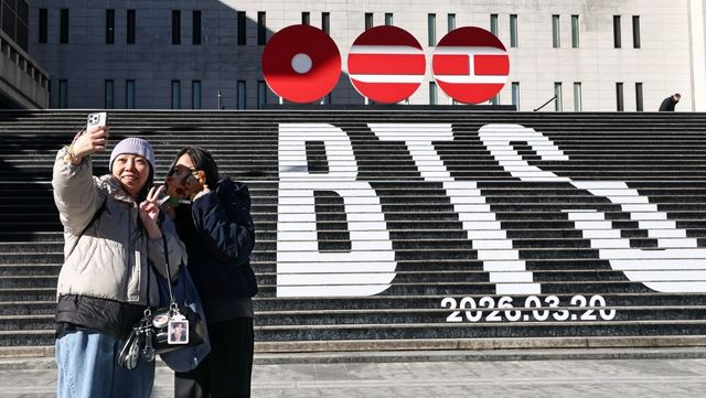 서울 종로구 세종문화회관 계단에서 홍콩에서 온 관광객들이 오는 3월 3년 9개월 만에 '완전체'로 돌아오는 그룹 방탄소년단(BTS)의 컴백을 알리는 홍보물을 기념촬영하고 있다. / 연합뉴스