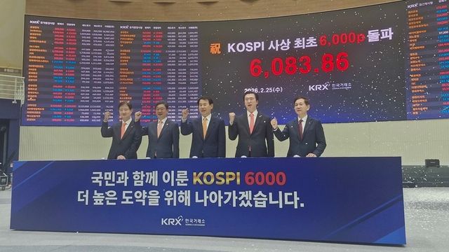 25일 코스피 지수가 6000선을 돌파하며 ‘6천피’ 시대를 열었다. 한국거래소에 따르면 이날 코스피 지수는 전 거래일 대비 1.91% 오른 6083.86포인트에 마감했다. 지난달 22일 사상 처음으로 장중 5000포인트를 달성한 지 약 한 달 만으로, 장중 한때 6100선도 돌파하며 상승폭을 키우기도 했다. 이날 반도체 대형주와 자동차주 상승세에 힘입어 코스피 상장사 시가총액 합계액도 사상 처음 5000조원을 넘어섰다.