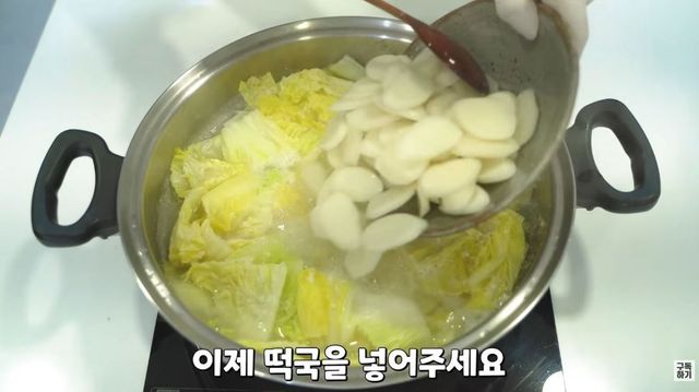 배추국에 떡국떡을 넣는 모습. / 유튜브 '함께해요 맛나요리'