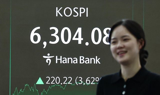 26일 서울 중구 하나은행 딜링룸 전광판에 코스피 지수가 6,300을 넘어서고 있다. / 뉴스1