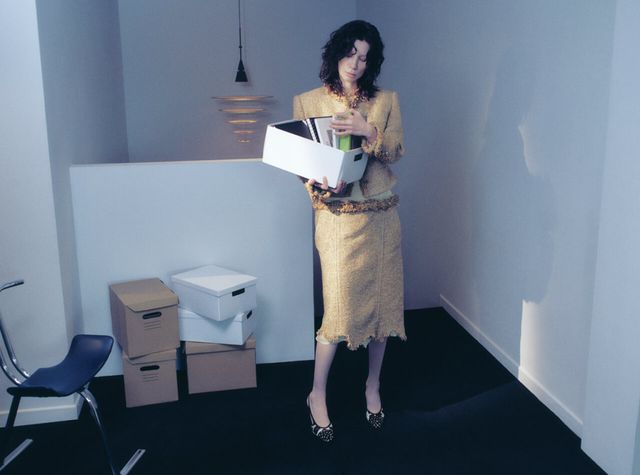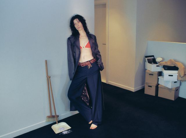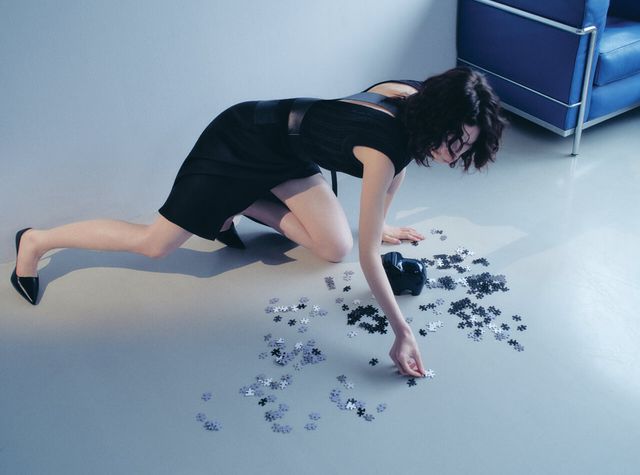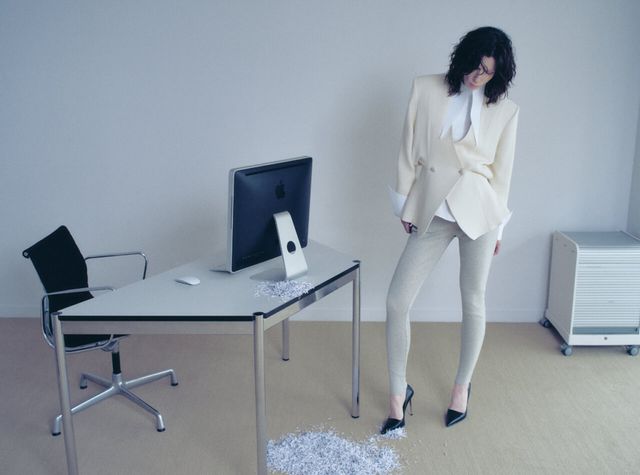 바이커 레더 베스트와 펜슬 스커트, 슬링백 펌프스, 타이츠 모두 SAINT LAURENT BY ANTHONY VACCARELLO