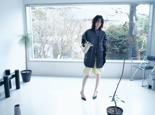 리나일론 재킷과 벌룬스커트, 페이턴트 슬링백, 새틴 글러브 모두