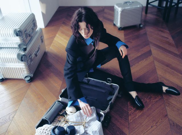 더블브레스트 재킷과 롱 슬리브 하이넥 셔츠, 니트 타이츠 팬츠 모두