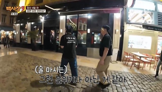 한판집과는 달리 다른 가게들엔 손님이 가득했다. 한판집 옆 식당도 마찬가지. 존박은 “사람이 별로 없다. 실망이다”라고 걱정하며 손님이 없는 이유를 알아내기 위해 거리로 나섰다. 밥집들이 다 술집으로 바뀐 상황. 붐비는 거리를 본 이장우는 “다 술이고, 너무 예쁘다”라고 놀랐고, 존박은 “우린 제대로 한판이라 (술 마시는) 분위기가 아닌 것 같다”라고 생각했다. 프랑스 사람들은 주말 저녁엔 술과 함께 먹을 수 있는 메뉴를 선호한다고.