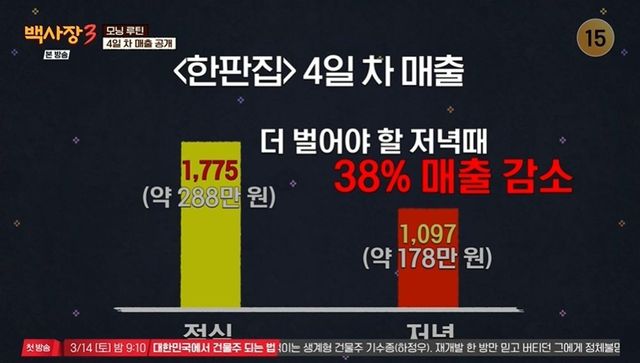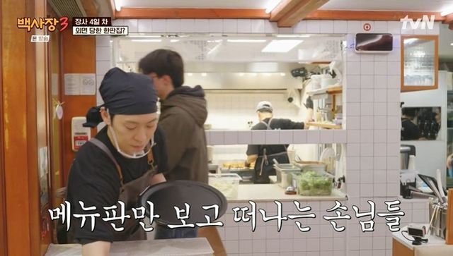손님 유인책이 사라진 상황. 백종원은 고추전을 서비스로 주자고 하며 “손님 많아 보이게 홀딩시켜야 한다”라고 이유를 밝혔다. 하지만 새로 들어오는 손님들은 메뉴판을 보고 떠났고, 기존 손님들까지 나가자 가게는 텅 비었다.