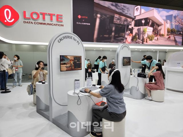 이번 ‘메타버스 엑스포’에서 가장 큰 부스를 꾸린 곳은 롯데정보통신(286940)의 메타버스 자회사 칼리버스다. 실제 가장 많은 관람객들이 줄을 지어 부스를 체험할 정도로 인기가 많았던 곳이다. 칼리버스는 이번 엑스포에서 초실감형 메타버스 플랫폼 ‘롯데 메타버스’의 다양한 버전을 공개했다. 헤드마운드디스플레이(HMD·헤드셋 형태) 기기 외에도 PC, 모바일 등으로 메타버스를 체험할 수 있는 기회를 관람객들에게 제공했다.