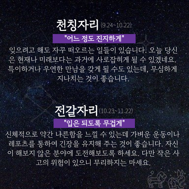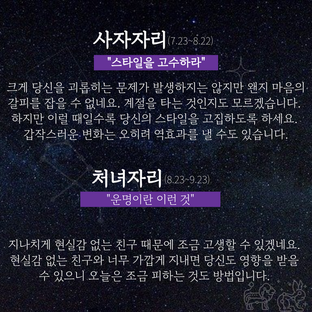 크게 당신을 괴롭히는 문제가 발생하지는 않지만 왠지 마음의 갈피를 잡을 수 없네요. 계절을 타는 것인지도 모르겠습니다. 하지만 이럴 때일수록 당신의 스타일을 고집하도록 하세요. 갑작스러운 변화는 오히려 역효과를 낼 수도 있습니다.