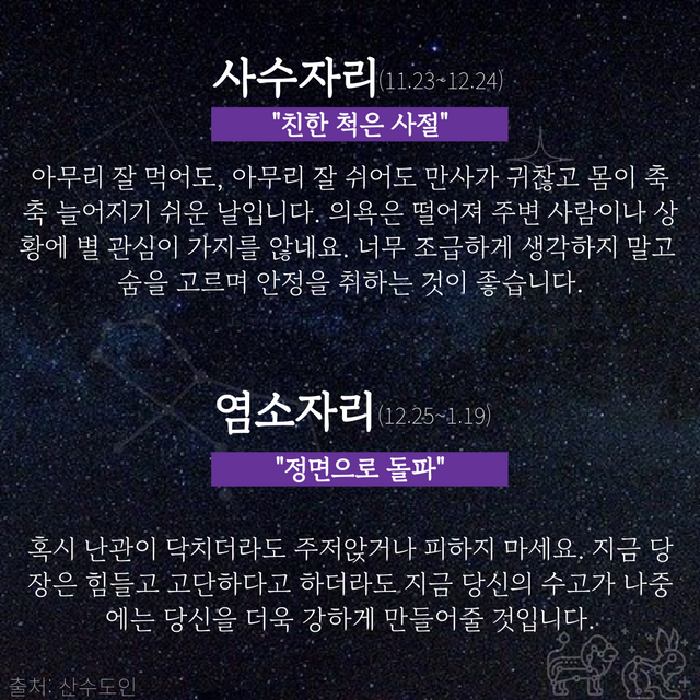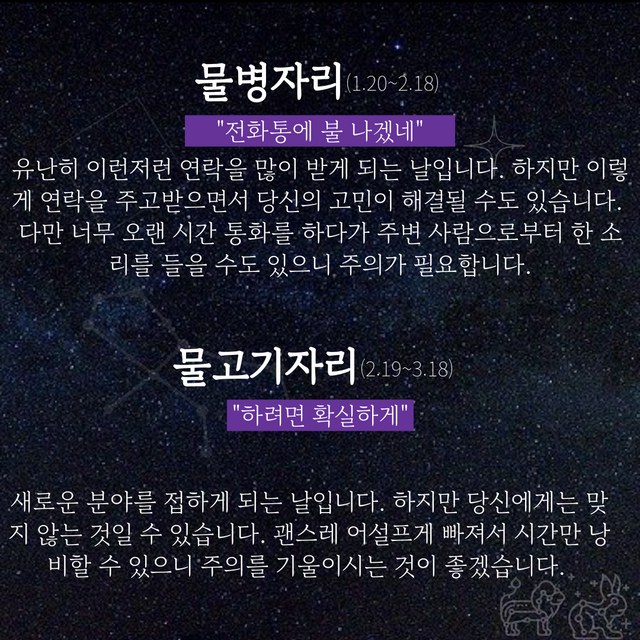 커플인 분이라면 상대방과 약간 거리를 두는 것도 좋습니다. 너무 붙어 있어서 서로에게 짜증이 날 수도 있으니까요. 싱글인 분이라면 그간 신경을 쓰지 않던 사람에게 갑자기 필이 꽂힐 수 있습니다.