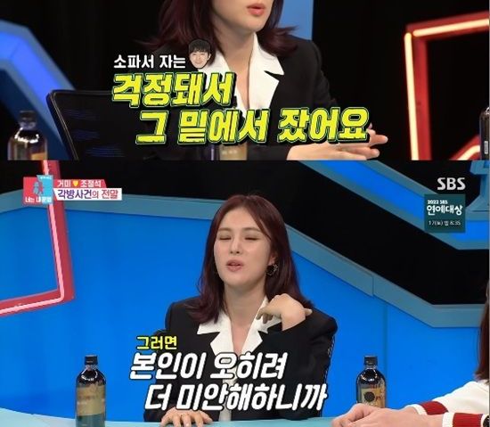 거미는 이지혜가 술을 먹고 늦게 들어와서 따로 잔 적은 있는지 묻자 있다고 했다. 조정석이 술을 마시고 소파에서 잠들었던 적이 있다는 것. 거미는 "소파에서 잘 때 테이블 같은 게 뾰족하거나 이런 게 걱정돼서 밑에서 제가 이불을 깔고 잔 적은 있다"고 덧붙여 다시 한 번 모두를 놀라게 했다.