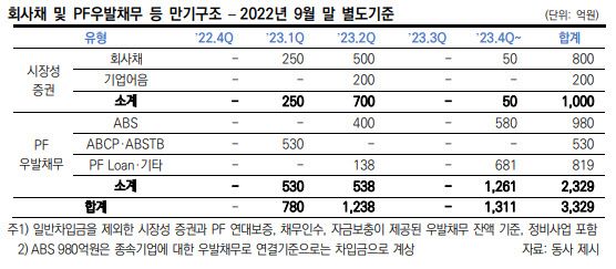 여기에 최근 부동산 경기 악화와 금리상승, 레고랜드 사태 등으로 건설 및 PF 유동화 시장의 자금경색이 급속도로 진행되고 있다는 점도 부담요인으로 꼽았다.