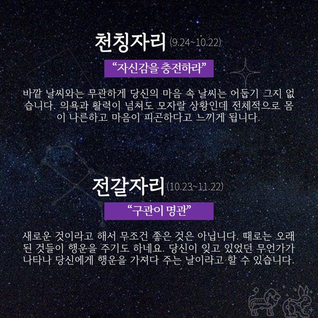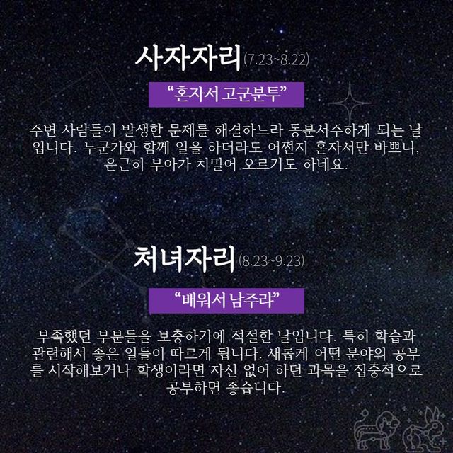 커플인 분이라면 상대방과 함께 하는 짧은 여행도 좋습니다. 기분도 전환하고 상대방을 향한 사랑을 좀더 키울 수도 있고요. 싱글인 분의 경우 편안한 만남이 아니라면 피하세요. 오늘 당신의 컨디션이 최상은 아니니 괜스레 나쁜 인상만 심어줄 수 있습니다.