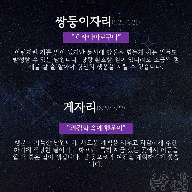 새로운 것이라고 해서 무조건 좋은 것은 아닙니다. 때로는 오래 된 것들이 행운을 주기도 하네요. 당신이 잊고 있었던 무언가가 나타나 당신에게 행운을 가져다 주는 날이라고 할 수 있습니다.