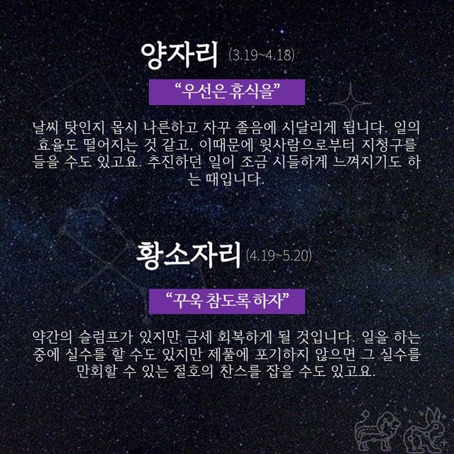 날씨 탓인지 몹시 나른하고 자꾸 졸음에 시달리게 됩니다. 일의 효율도 떨어지는 것 같고, 이때문에 윗사람으로부터 지청구를 들을 수도 있고요. 추진하던 일이 조금 시들하게 느껴지기도 하는 때입니다.